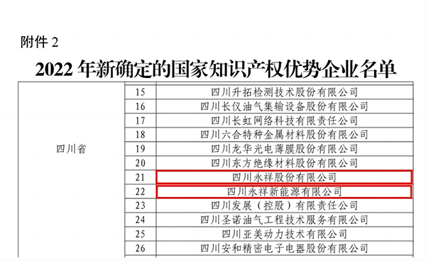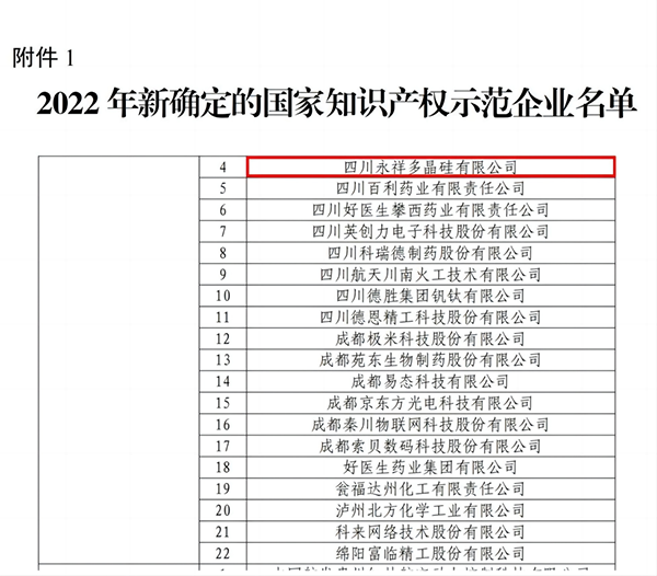 近日,國(guó)家知識(shí)產(chǎn)權(quán)局正式公布了2022年度“國(guó)家知識(shí)產(chǎn)權(quán)示范企業(yè)和優(yōu)勢(shì)企業(yè)”評(píng)定結(jié)果。永祥多晶硅公司獲評(píng)“國(guó)家知識(shí)產(chǎn)權(quán)示范企業(yè)”,永祥股份和永祥新能源公司分別獲評(píng)“國(guó)家知識(shí)產(chǎn)權(quán)優(yōu)勢(shì)企業(yè)”。