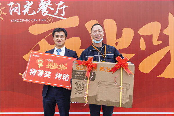 為回饋新老員工,開業(yè)活動還精選準備了幸運大抽獎活動,電烤箱、大米、食用油、餐券、水果等獎品琳瑯滿目,吸引了各部門員工紛紛駐足參與。抽獎現(xiàn)場,姚總為獲得大獎的幸運兒頒發(fā)獎品。