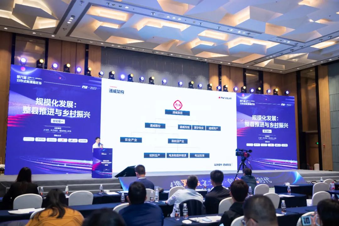 在“規模化發展:整縣推進與鄉村振興”分論壇環節,通威相關負責人以“通威高效組件助力分布式發展”為主題,全面介紹通威企業發展歷程、企業經營實力,并重點推介通威組件產品和分布式發展規劃布局,引發場內高度關注與互動交流。通威誠摯歡迎行業同仁深入交流,共謀光伏行業高質量發展新格局。