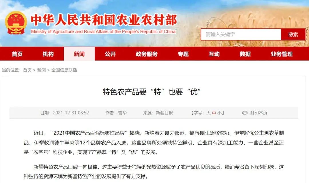 農(nóng)業(yè)農(nóng)村部官方網(wǎng)站轉載“2021中國農(nóng)產(chǎn)品百強標志性品牌”相關信息