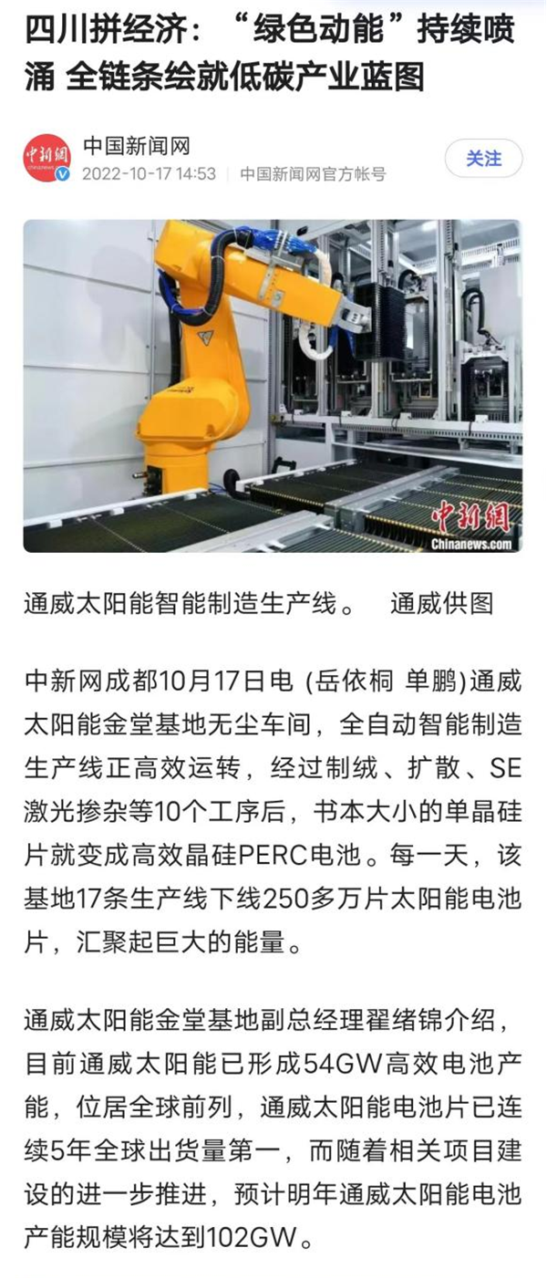 10月17日,中國新聞網發表題為《四川拼經濟:“綠色動能”持續噴涌 全鏈條繪就低碳產業藍圖》的文章,聚焦通威太陽能金堂基地的綠色低碳高質量發展。