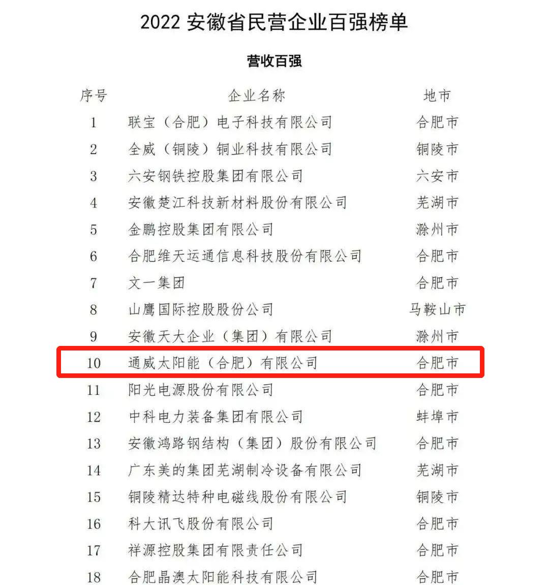 通威太陽能(合肥)有限公司榮列2022安徽省民營企業營收百強第10位