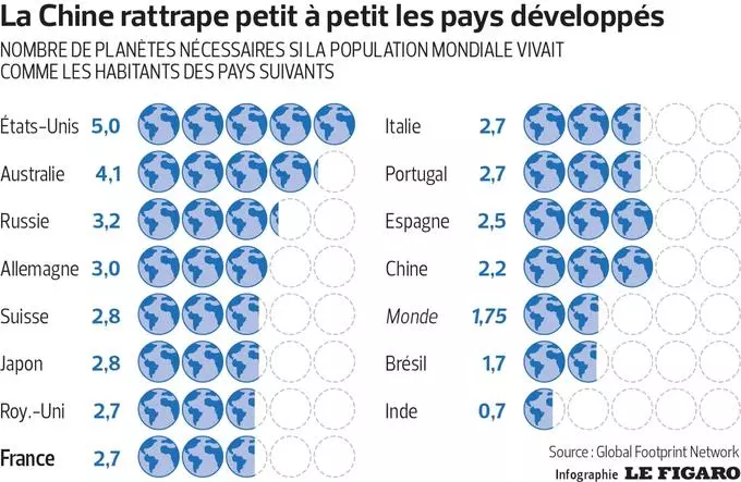 專家根據每個國家的消耗,還推算出人類所需要的地球數量。如果每個人都像法國人一樣生活,那么我們需要2.7個地球才足夠;按照美國這樣的高耗能,那么5個地球才能滿足我們。