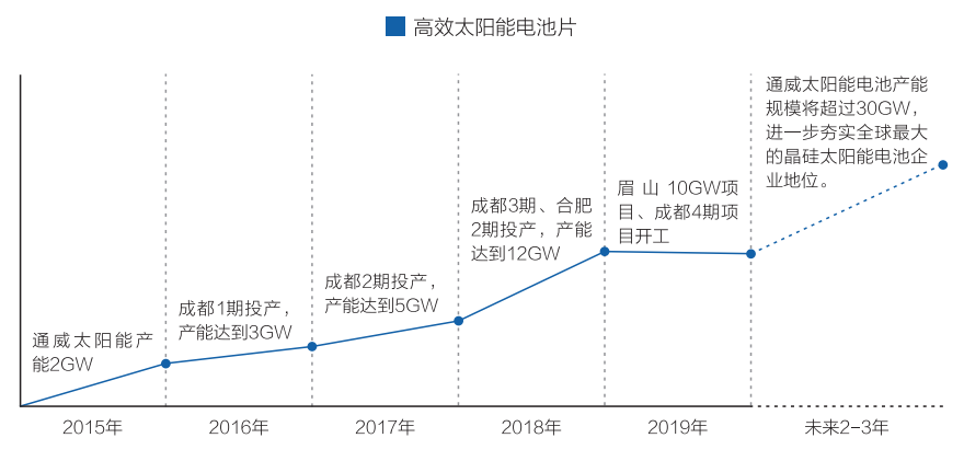 通威太陽能成都四期3.8GW 高效晶硅電池項目和10GW 高效晶硅電池項目分別在成都雙流和眉山正式開工。兩大項目產線上繼續以無人化生產為主,建設智能化工廠、數字化車間。與傳統人工產線相比,產線的人工數量、生產成本、產品不良率大幅下降,勞動效率、經濟價值方面得以大幅提高。隨著項目的快速落地,2019 年底,通威太陽能電池總產能將超過 20GW,將連續 3 年成為全球產能規模和出貨量最大的太陽能電池企業,全球市場占有率有望達到15%。未來2-3年,通威太陽能電池產能規模將超過 30GW,進一步夯實全球最大的晶硅太陽能電池企業地位。