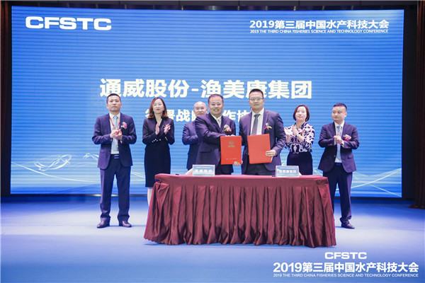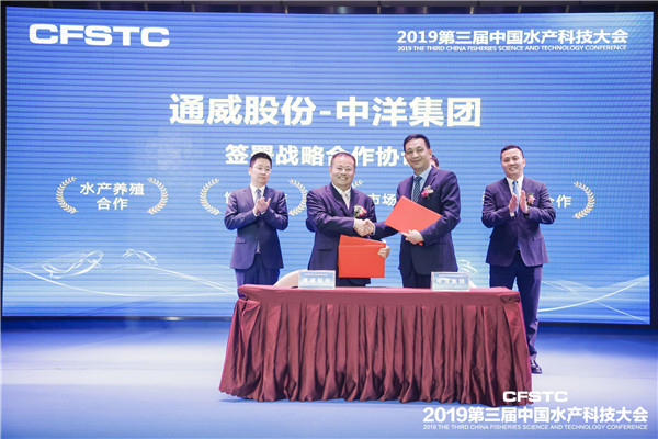 16時50分,在劉漢元主席、謝毅董事、錢曉明董事長等領導的見證下,通威股份郭異忠總裁分別與湖南漁美康生物技術集團有限公司總裁劉紹春、江蘇中洋集團股份有限公司常務副總裁朱永祥代表的兩家企業(yè)簽署了《通威-漁美康簽署戰(zhàn)略合作協議》、《通威-中洋簽署戰(zhàn)略合作協議》,攜手共促我國水產科技創(chuàng)新,推動行業(yè)邁入高質量發(fā)展軌道!