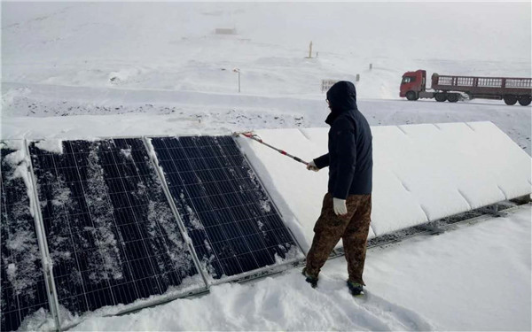 志愿者為光伏發電系統掃雪
