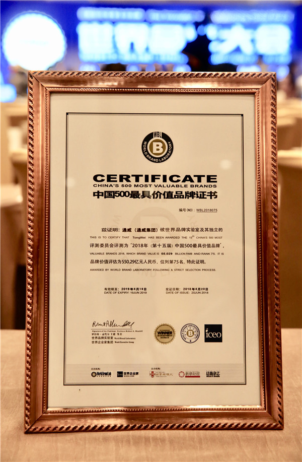2018年6月20日,2018年第十五屆世界品牌大會暨中國500最具價值品牌發布會隆重舉行。2018年,通威集團以550.29億元的品牌價值再次榮列榜單,連續15年入選公信力和認同度最高、權威性最強的中國品牌國家隊行列。多年來,在劉主席的高度重視和親自帶領下,通威品牌建設創新探索、與時俱進、碩果累累,社會認知度、美譽度逐年增強。從2004年的19億元,到2018年一舉突破550億元,通威品牌建設不斷刷新歷史新高,展示了全球綠色農業和綠色能源領軍品牌的雄厚實力。