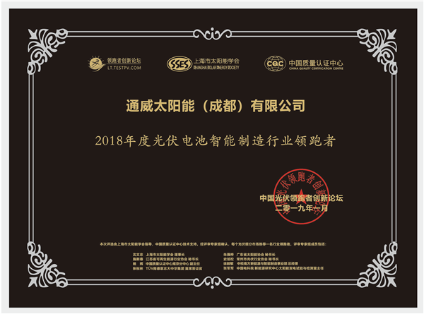 通威太陽能榮膺“2018年度光伏電池智能制造行業(yè)領跑者”殊榮