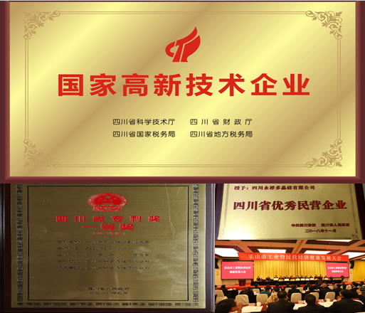 1月3日,永祥多晶硅榮獲四川省科技進步二等獎;1月22日,四川永祥股份有限公司榮獲“國家高新技術企業”稱號;9月21日,永祥多晶硅榮獲四川省專利獎一等獎;11月20日,四川省民營經濟健康發展大會上,永祥再次榮獲“優秀民營企業”重磅榮譽;11月23日,在樂山市工業暨民營經濟健康發展大會上,通威股份董事、永祥股份董事長兼總經理段雍應邀出席會議并作主題發言,永祥股份榮獲“新認定的國家高新技術企業2017年度稅收入庫收入首上臺階獎金50萬元”獎勵;此外,11月,永祥多晶硅先后獲得2018年度“光能杯”CREC評選年度“優秀光伏材料企業”、“中國好光伏”2018年度“最佳光伏材料供應商”、2018年“北極星杯”“最受歡迎十大光伏原材料及輔料品牌”、2018“科維杯”OFweek2018“卓越光伏材料商”等殊榮;2018年,段雍董事長先后獲評“年度環保人物”、“優秀中國特色社會主義事業建設者”稱號。這些榮譽的取得,有力地彰顯了公司的影響力和發展活力。