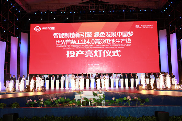 2017年9月20日,通威太陽能世界首條工業(yè)4.0高效電池生產(chǎn)線投產(chǎn)亮燈儀式隆重舉行。通威集團董事局劉漢元主席與35位重磅嘉賓共同啟動亮燈儀式,標(biāo)志著通威“智能制造新引擎 綠色發(fā)展中國夢”征程的全新啟航。
