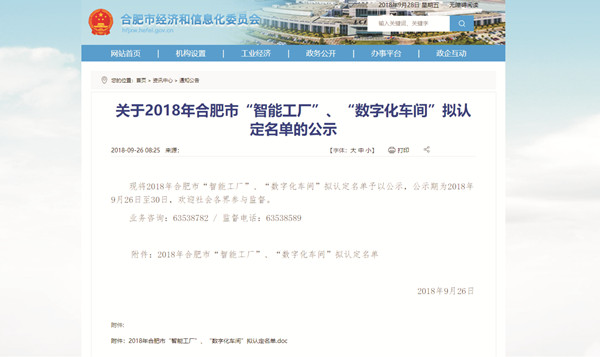 本次名列公示榜單的還有聯寶(合肥)電子科技有限公司、合肥京東方視訊科技有限公司等16家“智能工廠”和175家 “數字化車間”。公示期為2018年9月26日至30日。