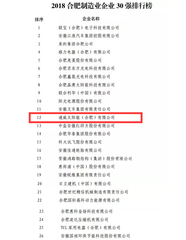 會(huì)議發(fā)布了2018合肥企業(yè)50強(qiáng)榜單、2018合肥制造業(yè)企業(yè)30強(qiáng)榜單、2018合肥服務(wù)業(yè)企業(yè)20強(qiáng)榜單、2018合肥建筑業(yè)企業(yè)20強(qiáng)榜單。通威太陽能合肥公司成功入選2018合肥企業(yè)50強(qiáng)榜單、2018合肥制造業(yè)企業(yè)30強(qiáng)榜單,分別從2017年第39位、第17位躍居第26位、第12位,通威太陽能合肥公司已連續(xù)多年入列雙強(qiáng)榜單,位次逐年攀升、增長勢(shì)頭強(qiáng)勁。