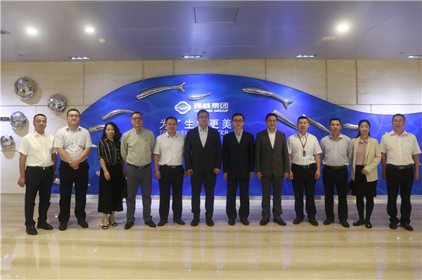 郭總向凌總、周總一行轉達了劉漢元主席的問候,并介紹了通威的基本情況。郭總表示,經過36年的發(fā)展,通威已經形成了農牧和新能源雙主業(yè)發(fā)展格局。在農牧領域,通威形成了從種苗、飼料、動保、機械、養(yǎng)殖技術到水產流通的全產業(yè)鏈能力;在新能源領域,通威已成為擁有從上游高純晶硅生產、中游高效太陽能電池片生產、到終端光伏電站建設的垂直一體化光伏企業(yè)。與此同時,通威將兩大主業(yè)高度融合,全球首創(chuàng)“漁光一體”商業(yè)模式,實現(xiàn)“水上產出清潔能源,水下產出健康水產品”,大大提升了土地的綜合利用效益,改變了中國水產養(yǎng)殖的傳統(tǒng)生產方式,推動了中國水產養(yǎng)殖向規(guī)模化、設施化、智能化轉變。