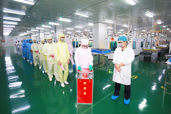 5月1日一大早,合肥、成都兩地各生產車間一線作業員們早早便來到了設在廠區內的各投票點,在投票箱前排起了長龍,將填寫好的寶貴選票投入票箱內。