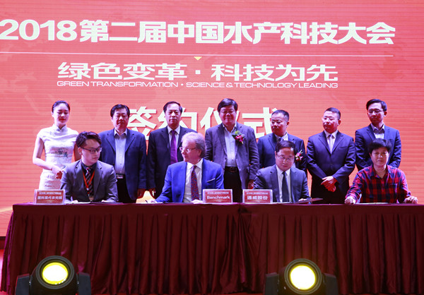 為樹立和嘉獎行業標桿,激活創新動能,大會隆重舉行了“2018中國水產科技大會頒獎盛典”。由水產權威機構與企業代表組成的評委團,根據科技創新、行業貢獻等方面進行綜合評比,最終評選并現場頒發了“年度突出科技創新獎”、“年度杰出成果轉化獎”、“年度卓越貢獻獎”、“年度最佳商業模式獎”四大重磅獎項。大會期間,通威股份嚴虎副董事長,英國BENCHMARK控股有限公司董事、比利時英偉水產集團全球總裁Philippe Leger,國科現代農業產業科技創新研究院國際合作交流中心總監助理任意達,河北鑫海水產生物技術有限公司董事長許圣鈺分別代表四家企業上臺,共同簽署《四方戰略合作意向框架協議》,攜手共促我國水產科技創新,推動行業快速發展!