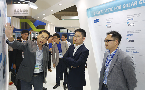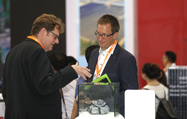 國(guó)外參展商在通威展臺(tái)查看多晶硅原料