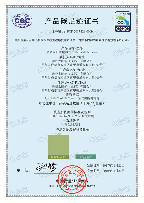 通威太陽能(成都)有限公司榮獲CQC產品碳足跡證書