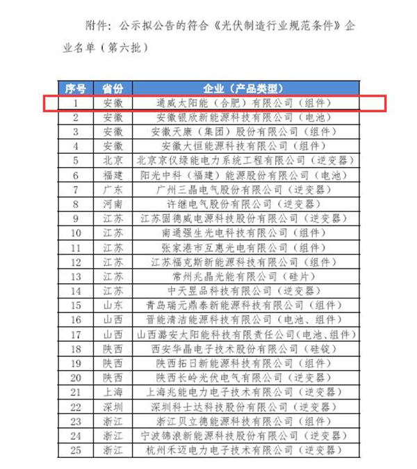 通威太陽能(合肥)有限公司入列《光伏制造行業規范條件》企業名單(第六批)