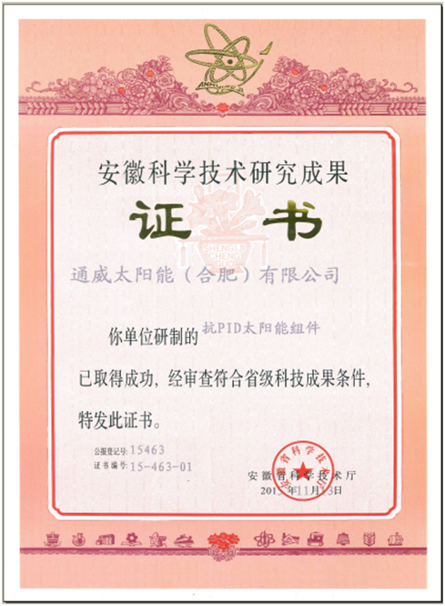 通威太陽能(合肥)有限公司產品獲“安徽科學技術研究成果”證書