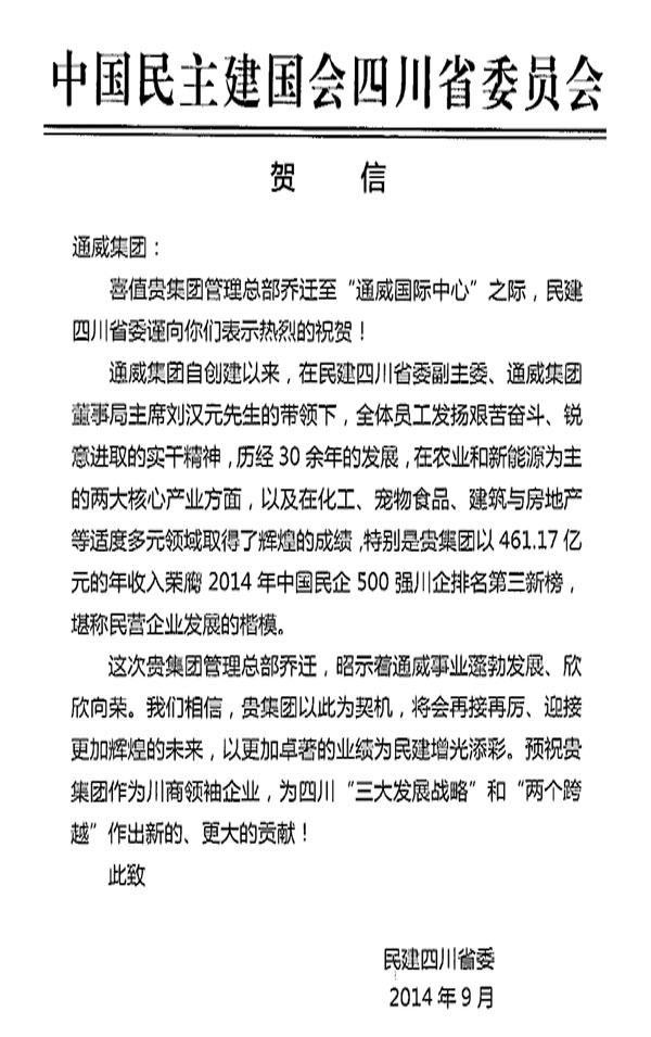 民建四川省委恭祝通威集團(tuán)喬遷大吉