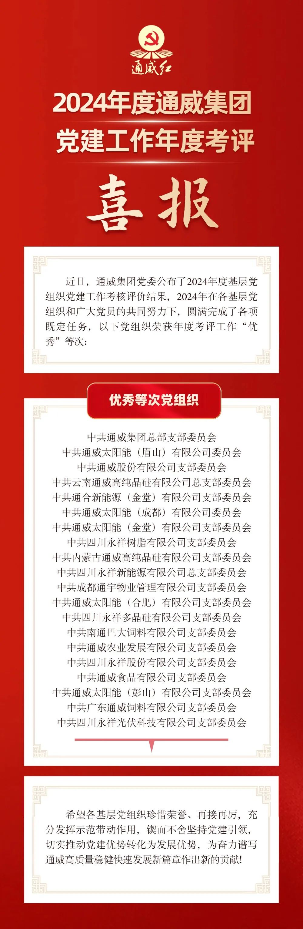 喜報!通威集團基層黨組織榮獲年度黨建工作考核優秀等次!