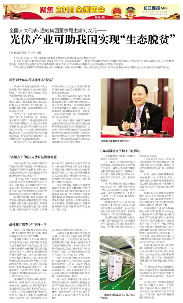 3月3日,全國人大代表、通威集團董事局主席劉漢元帶著今年兩會議案奔赴北京。赴京前夕,劉漢元接受長江商報記者采訪時介紹,他今年的議案之一,是關于“環(huán)境脫貧”和“生態(tài)脫貧”等的建議:我國可充分發(fā)揮政治體制優(yōu)勢,全力支持促進光伏、風能等再生能源產業(yè)的可持續(xù)健康發(fā)展,用五到十年時間集中力量再打一場環(huán)境和生態(tài)等的扶貧攻堅戰(zhàn)。