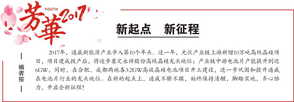 2017年是通威在新能源產業發展的第10個整年。回顧2017,展望2018,通威集團禚玉嬌總裁把通威進入光伏10年的發展歷程總結為三個階段——5、3、2。禚總指出:“我們把前5年視為通威確定光伏發展戰略,進入光伏行業發展的初期階段;把中間的3年視為通威實施光伏產業戰略布局階段;把后面的2年視為通威光伏產業跨越發展階段。”