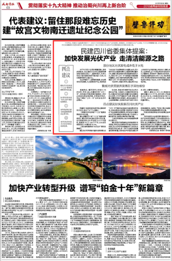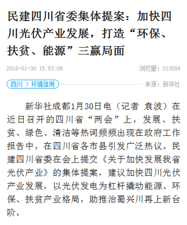 近日召開的四川省“兩會(huì)”上,民建四川省委集體提交了一份《關(guān)于加快發(fā)展我省光伏產(chǎn)業(yè)的提案》。提案建議,加快推進(jìn)光伏產(chǎn)業(yè)發(fā)展,不僅可改善霧霾問題,還可結(jié)合我省先天資源稟賦和優(yōu)越地理特點(diǎn),率先在全國(guó)走出一條以水電和光伏發(fā)電作為主要能源供應(yīng)的清潔發(fā)展之路。該提案引發(fā)社會(huì)各界廣泛熱議,并受到主流媒體的強(qiáng)烈關(guān)注,新華社刊出《民建四川省委集體提案:加快四川光伏產(chǎn)業(yè)發(fā)展,打造“環(huán)保、扶貧、能源”三贏局面》的報(bào)道文章,閱讀量突破24萬,關(guān)注熱度還在持續(xù)增長(zhǎng)。