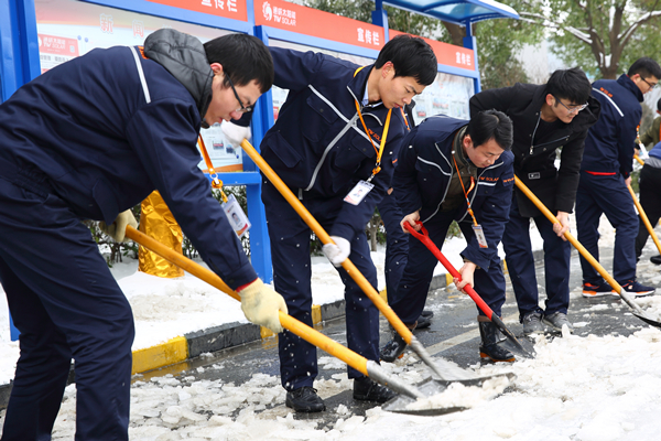 1月26日上午10時,合肥公司各部門共計一百余人分散到廠區主干道、食堂通道等員工必經道路,分頭作業,責任區域,清除道路積雪,清理道路安全隱患。