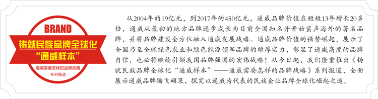 隨著集團(tuán)的不斷發(fā)展壯大,品牌意識(shí)愈加強(qiáng)烈。在主席的高度重視和帶領(lǐng)下,在各具體職能部門長期強(qiáng)力推動(dòng)和有效執(zhí)行下,通威憑借多年品牌建設(shè)不斷強(qiáng)化的社會(huì)認(rèn)知度、美譽(yù)度和持久穩(wěn)固的信任度、依存度,憑借在農(nóng)業(yè)、新能源領(lǐng)域?yàn)橹袊酥潦澜缢a(chǎn)養(yǎng)殖、糧食安全、食品安全、能源安全、低碳經(jīng)濟(jì)等綠色可持續(xù)發(fā)展做出的持續(xù)努力和積極貢獻(xiàn),2017年集團(tuán)再度榮列中國500最具價(jià)值品牌這一國際公信力和認(rèn)同度最高、權(quán)威性和參鑒性最強(qiáng)的中國品牌國家隊(duì),品牌價(jià)值首次突破450億元大關(guān),達(dá)450.62億元人民幣,推動(dòng)通威品牌建設(shè)實(shí)現(xiàn)歷史性跨越。正因如此,2017年12月20日,主席在“2017品牌年度人物峰會(huì)頒獎(jiǎng)盛典”上榮膺“2017中國十大品牌年度人物”殊榮。