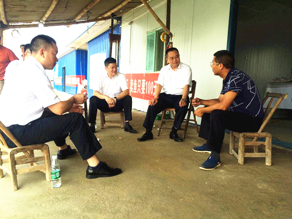 頂著烈日,郭總首先走訪了位于孝感三叉的高檔料養(yǎng)殖示范基地,與孝南區(qū)水產(chǎn)局工作人員圍繞規(guī)模化養(yǎng)殖、養(yǎng)殖模式升級等進行了深入探討,并針對養(yǎng)殖前端料(苗種料)的定位展開進一步溝通交流。