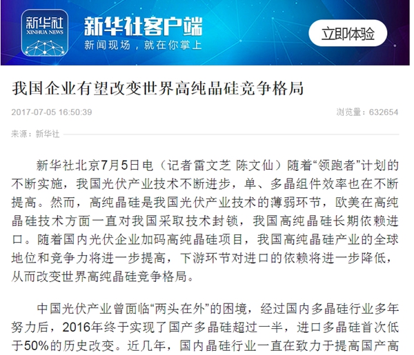 據(jù)新華社報(bào)道,隨著“領(lǐng)跑者”計(jì)劃的不斷實(shí)施,我國(guó)光伏產(chǎn)業(yè)技術(shù)不斷進(jìn)步,單、多晶組件效率也在不斷提高。然而,高純晶硅是我國(guó)光伏產(chǎn)業(yè)技術(shù)的薄弱環(huán)節(jié),歐美在高純晶硅技術(shù)方面一直對(duì)我國(guó)采取技術(shù)封鎖,我國(guó)高純晶硅長(zhǎng)期依賴(lài)進(jìn)口。隨著國(guó)內(nèi)光伏企業(yè)加碼高純晶硅項(xiàng)目,我國(guó)高純晶硅產(chǎn)業(yè)的全球地位和競(jìng)爭(zhēng)力將進(jìn)一步提高,下游環(huán)節(jié)對(duì)進(jìn)口的依賴(lài)將進(jìn)一步降低,從而改變世界高純晶硅競(jìng)爭(zhēng)格局。