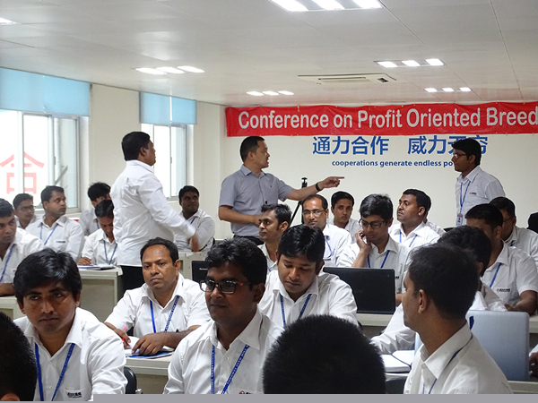 座談會(huì)上,孟加拉通威各部門(mén)管理人員首先總結(jié)了2016年工作,重點(diǎn)匯報(bào)了2017年工作規(guī)劃及開(kāi)展思路。在聽(tīng)取匯報(bào)并對(duì)水產(chǎn)和禽料市場(chǎng)實(shí)地考察后,洪總首先分享了海陽(yáng)通威和和平通威的轉(zhuǎn)型經(jīng)驗(yàn),并與公司管理人員共同分析了孟加拉通威目前所遇到的困難,對(duì)問(wèn)題一一提出了可行的解決方案,同時(shí)洪總表示,經(jīng)營(yíng)班子必須要解放思想,轉(zhuǎn)變觀念,敢打敢拼。