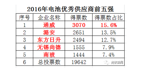 活動啟動以來,累計線投票近15萬人次,關注突破20萬人次。在歷時19天的激烈的角逐中,通威太陽能電池片以最高投票數入圍“2016年電池優秀供應商前五強”并榮摘冠軍。