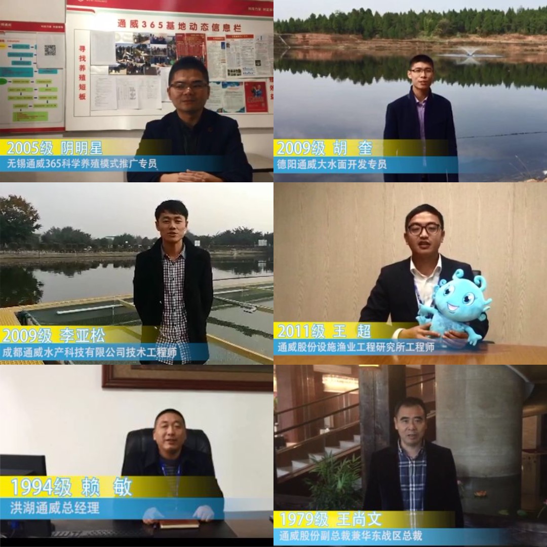 得知要在四川省水產學校舉行頒獎典禮,眾多校友紛紛“穿越”萬里,從全國各地傳來視頻表達對老師、同學們的真摯祝福。其中,通威股份副總裁兼華東戰區總裁王尚文、洪湖通威總經理賴敏驚喜“現身”引發全場歡呼。