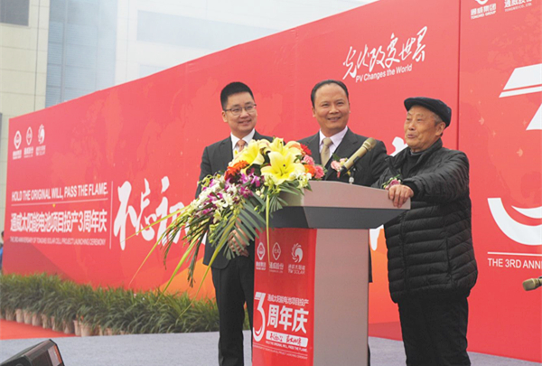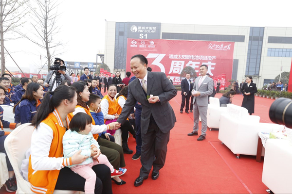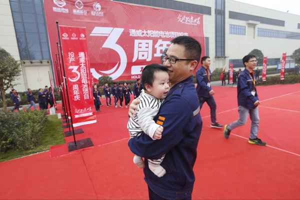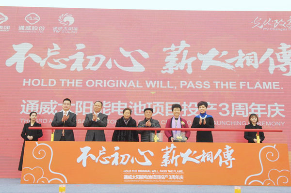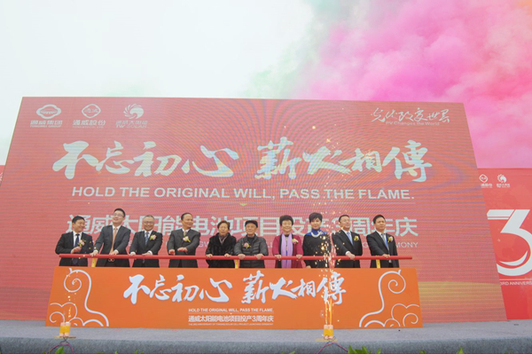 11月18日,通威太陽能電池項目投產三周年慶在通威太陽能(成都)有限公司廠區隆重舉行。通威大家庭的三位“大家長”————劉老太爺、楊老太太、曹老太太親臨現場,十一屆全國政協常委、通威集團董事局劉漢元主席,通威集團管亞梅董事長,通威集團副總裁胡榮柱,通威集團副總裁黃其剛,通威集團財務總監肖吉華,通威太陽能(合肥、成都)有限公司董事長謝毅,通威股份董事、永祥股份董事長兼總經理段雍,通威集團財務部部長高原柏,通威集團人力資源部部長易繼成,深圳通威新能源有限公司總經理鄧衛平等領導出席慶典儀式,通威太陽能(合肥、成都)有限公司全體高管、成都公司員工及家屬代表參加儀式,合肥公司同步進行視頻連線。