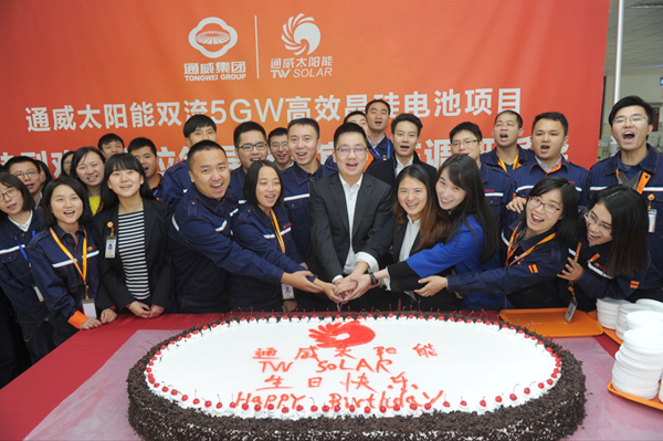 當天,通威太陽能(合肥)有限公司200余名員工通過視頻直播觀看了盛大的慶典儀式。拔河比賽、員工生日會等一系列的企業文化活動在兩地同步舉行,在成都公司,謝董事長與廣大員工共切蛋糕,同慶“11·18”這一通威太陽能發展歷程中的重要紀念節日。