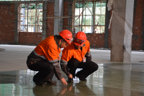 段董事長與李總觀察地坪打磨情況