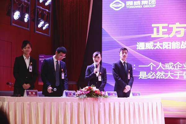“請問努力是否一定會成功?”“成功道路上是否需要把握偶然因素?”“既然你的成功是偶然大于必然,那么現在需要做什么?”“合肥太陽能的成功是領導決策重要還是等待競爭對手失敗重要?”在攻辯環節,雙方可謂是針尖對麥芒,不僅引經據典、談古論今,還用華為、諾基亞品牌等大量的企業事例論證自身觀點,同時,更結合通威太陽能成功模式、永祥股份產業鏈發展成果、通威365養殖模式等展開火熱辯論。從奧運賽場、光伏市場再到現實生活,反方辯手還現場唱起了王菲的《傳奇》……在辯論過程中,雙方戰隊的辯論風采讓現場亮點不斷,觀眾們大呼過癮,掌聲不斷。