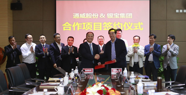 10月10日——10月11日,江蘇銀寶控股集團有限公司董事長、黨委書記、總經理張國山,銀寶集團副總經理、銀寶創業投資公司董事長周錫軍一行到訪通威,十一屆全國政協常委、通威集團董事局劉漢元主席,通威股份郭異忠總裁,通威股份副總裁兼華東戰區總裁王尚文熱情接待并座談,通威惠金新能源有限公司總經理馮德志,通威股份財務部部長宋梟、行政部部長鄭建偉、發展部部長陳勇峰,成都通威動物營養科技有限公司總經理陳波陪同座談。