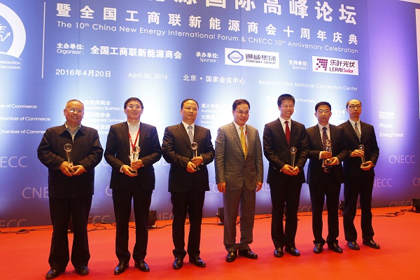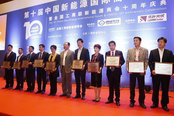 2016年恰逢《中國可再生能源法》頒布十周年,也是全國工商聯(lián)新能源商會成立的十周年,為此,論壇評選出了“中華新能源十年名人獎”、“中華新能源十年貢獻獎”等重磅獎項。通威集團董事局劉漢元主席榮獲“中華新能源十年名人獎”、通威集團榮獲“中華新能源十年貢獻獎”,禚玉嬌總裁代表集團上臺領(lǐng)獎。