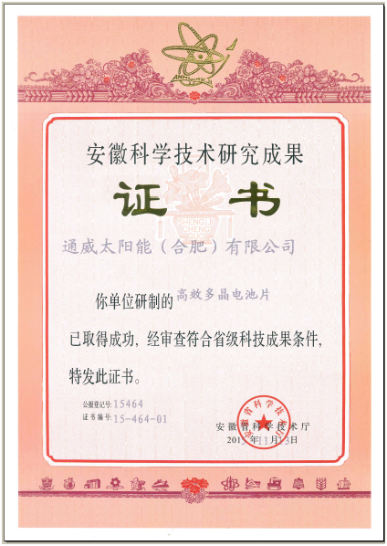 近日,通威太陽能(合肥)有限公司抗PID太陽能組件、漁光一體雙玻組件、高耐候性太陽能電池組件及高效多晶電池片四項產(chǎn)品獲評“2015年安徽科學(xué)技術(shù)研究成果”,并榮獲由安徽省科學(xué)技術(shù)廳頒發(fā)的“安徽科學(xué)技術(shù)研究成果”證書。